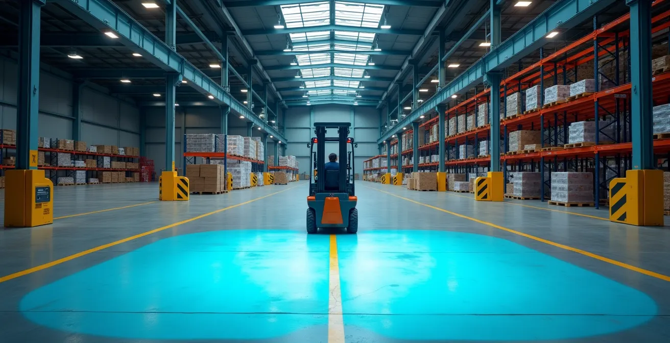 L’intégration de dispositifs d’alerte visuelle et sonore n’est plus une option, mais une norme de base dans la gestion des risques liés aux chariots élévateurs. Les “Blue Spots”, ces projecteurs qui créent un point lumineux bleu au sol devant ou derrière le chariot en mouvement, et les détecteurs de piétons à ultrasons ou radar, agissent comme une première ligne de défense cruciale. Leur rôle n’est pas de remplacer la vigilance, mais de la compléter en palliant les failles de la perception humaine dans un environnement bruyant et dynamique.